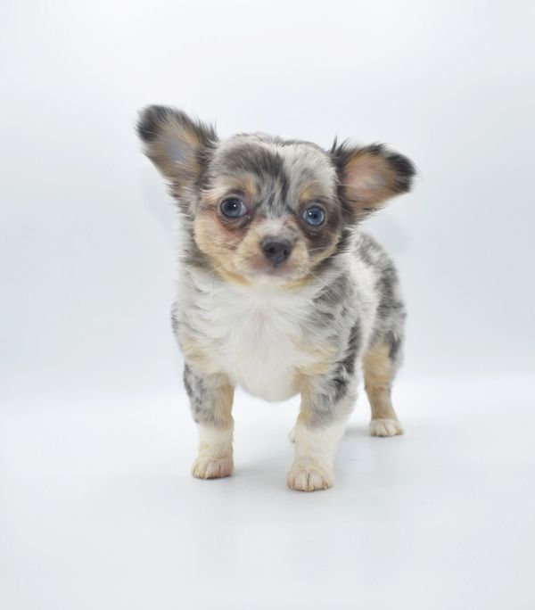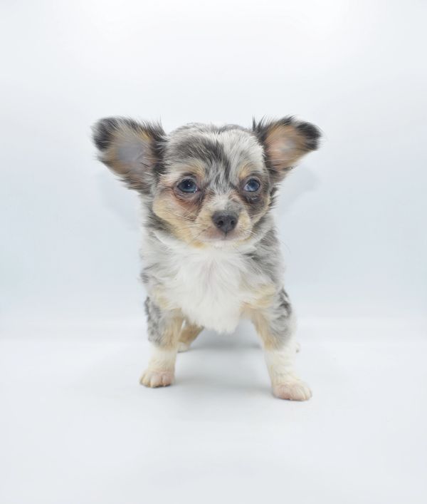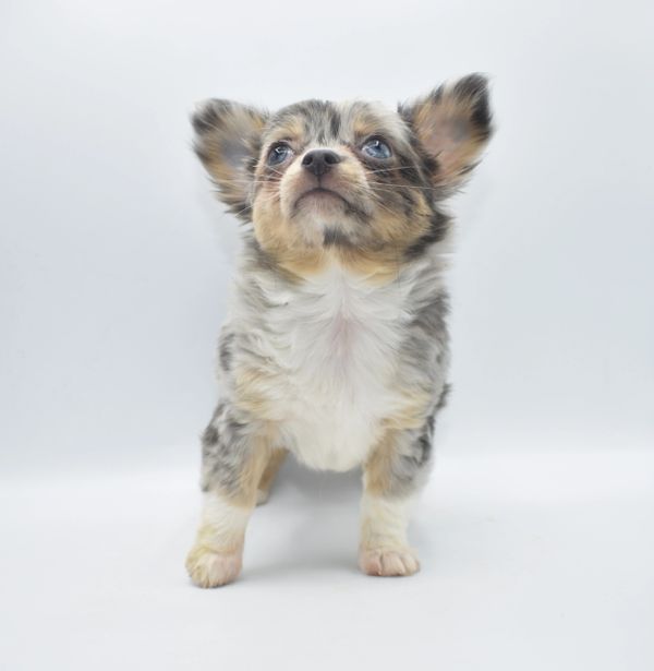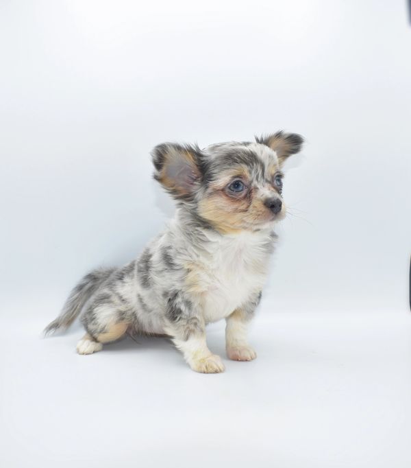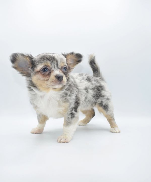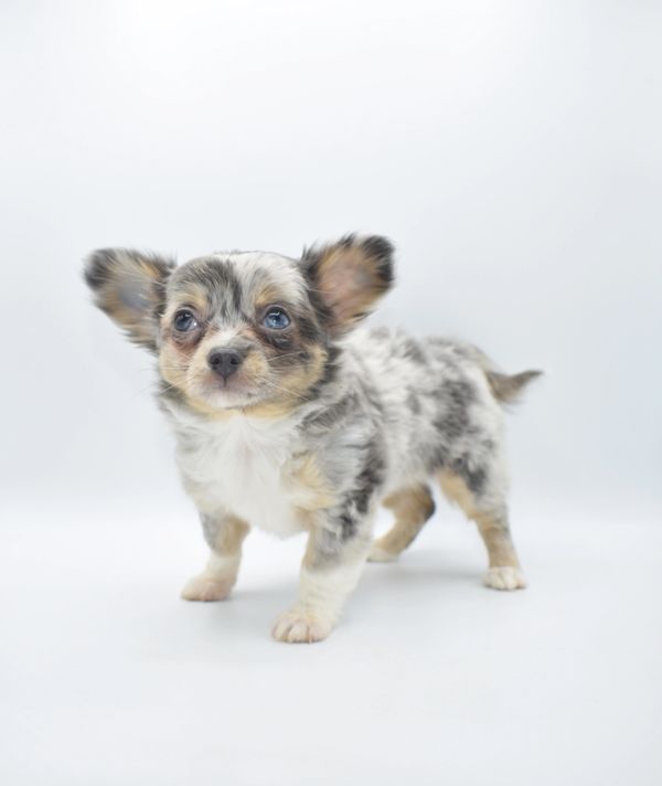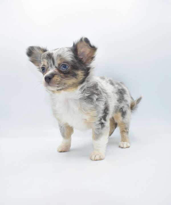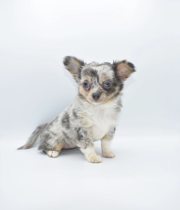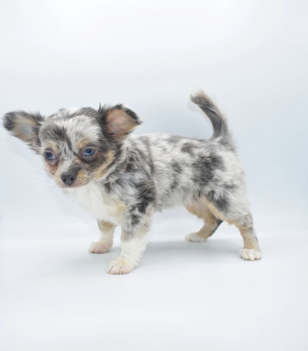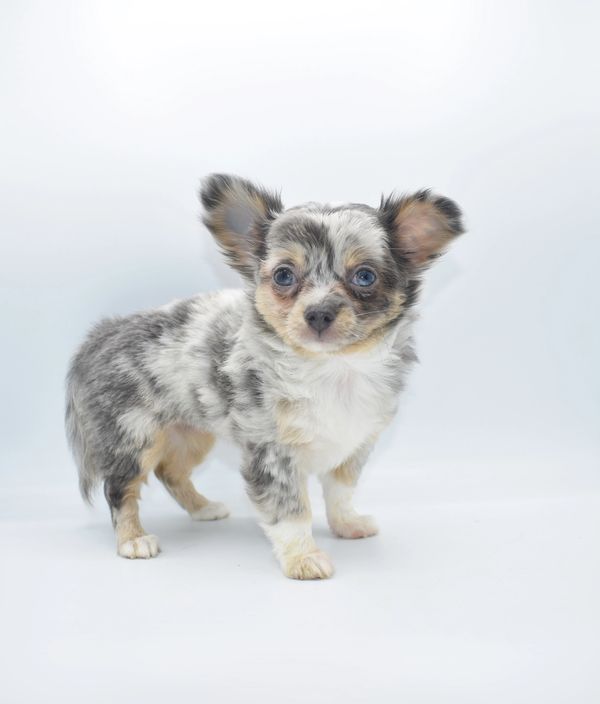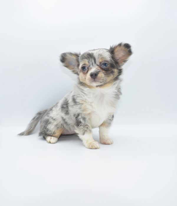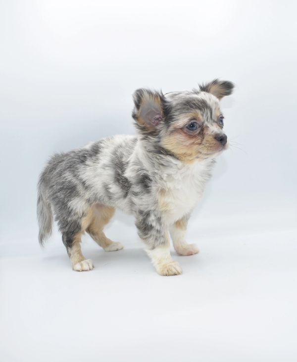 This is a beautiful Blue Merle, with Tan Points. She is extremely unique and have 2 different colored eyes. She has one blue and one green; she got this from her daddy. This sweet girl is a longhair. She was born on 12-04-25 and is ready to go. We are now accepting $500 nonrefundable deposit to reserve her.