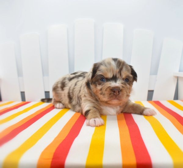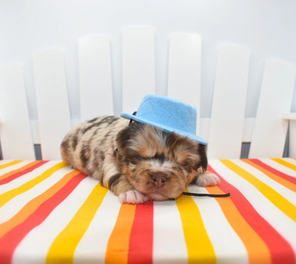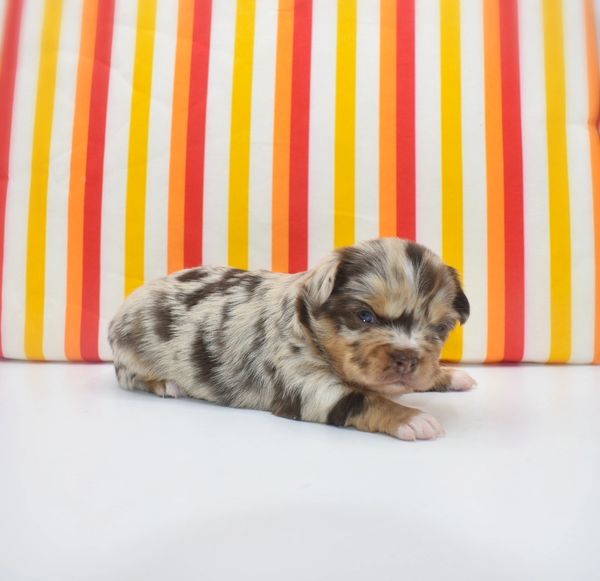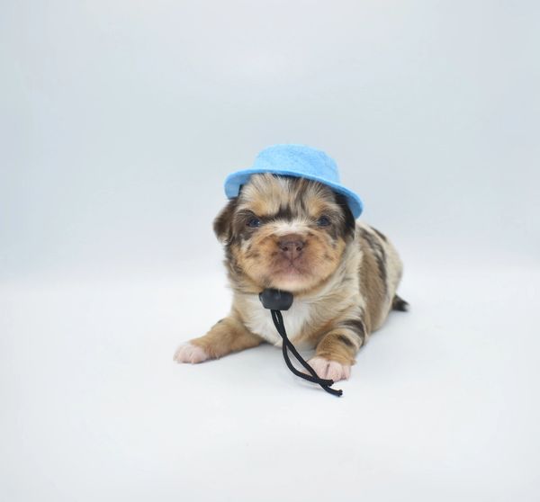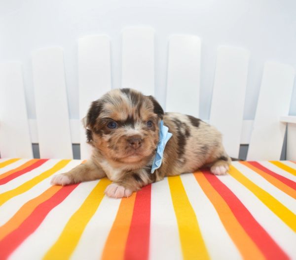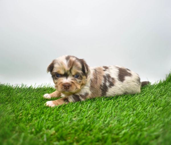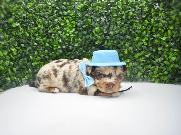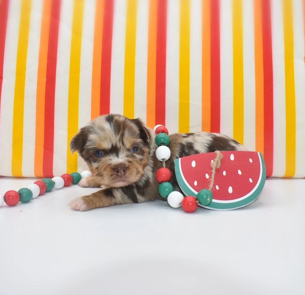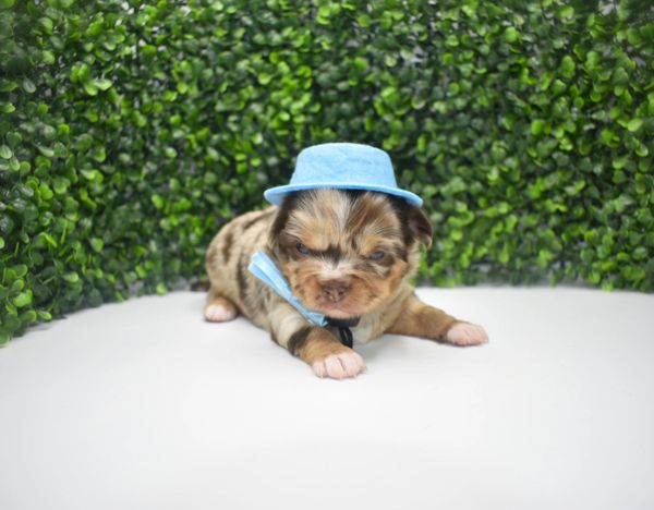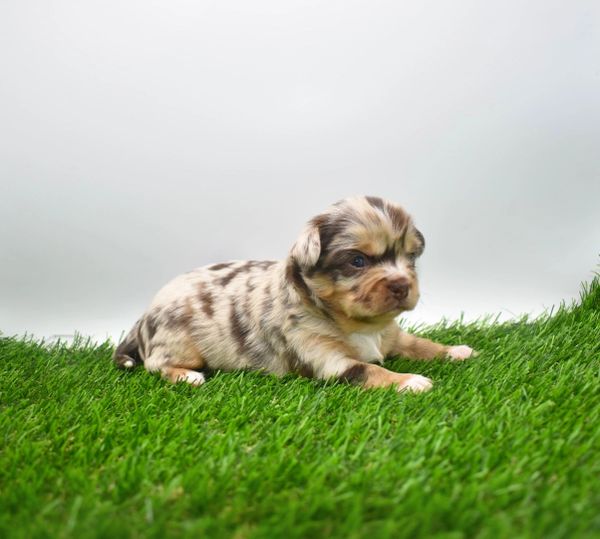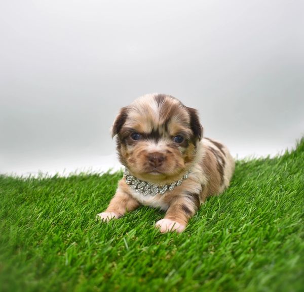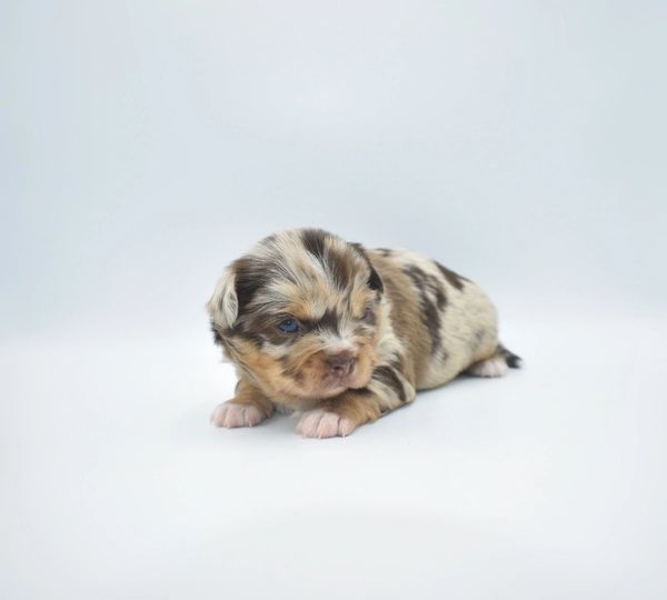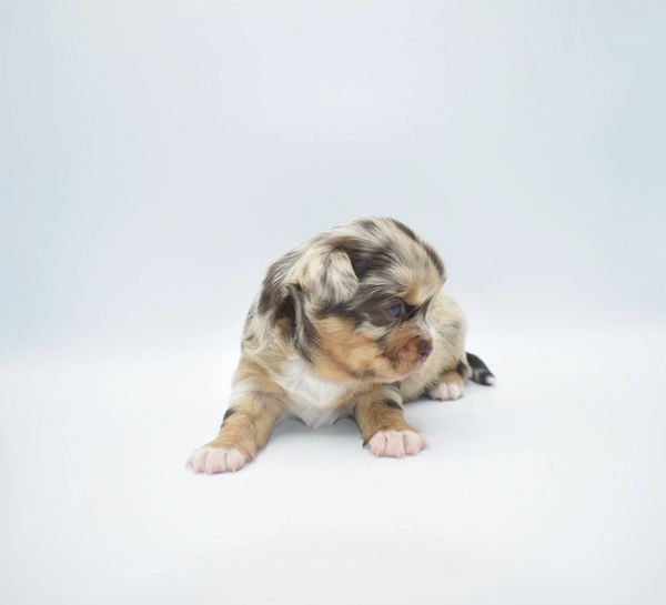 Hopper, is a STUNNING Black Merle with Tan Points on one half of his face. He will be a longhair and a bigger chihuahua. He was born on 03-24-2026 and will be 8 weeks of age on May 19th. We are now accepting $500 nonrefundable deposit to reserve him.