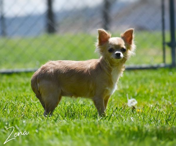 Meet our sweet girl Esme, she is a black spotted on white smooth coat and has a perfect applehead. She is a very laid-back girl and loves to play with her toys. Esme has Champion and Grand Champion throughout her pedigree. She is dual registered with AKC & CKC. Esme weighs 4.5 pounds, she has been Embark tested and cleared.